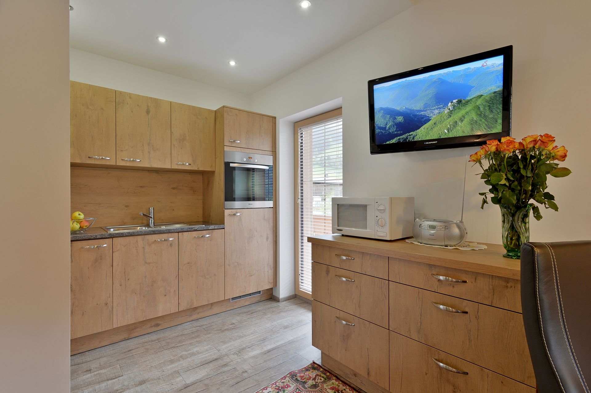 große Wohnküche mit Geschirrspüler, Cerankochfeld, Backofen, Dunstabzug, Microwelle, Kaffeemaschine, Wasserkocher, große Eckbank mit Tisch für bis zu 6 Personen